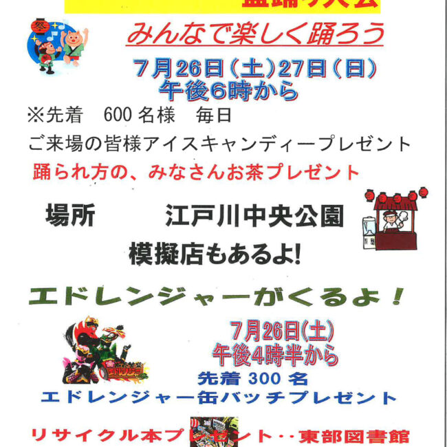 7月26日(土)27日(日)第42回チャリティー盆踊り大会 26日午後4時半からエドレンジャー登場!