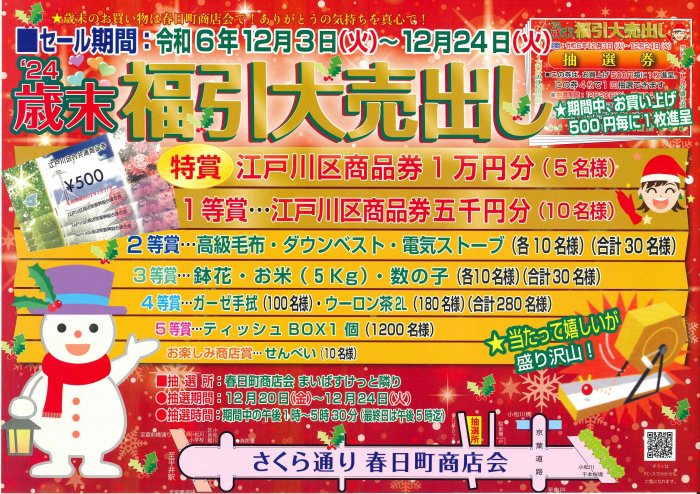 11月202024【歳末福引大売出し】 12月3日(火)~12月24日(火) お買い上げ500円毎に抽選券1枚進呈、4枚で1回抽選できます。 抽選期間:12月20日(金)~12月24日(火) 抽選時間:午後1時~5時30分(24日は午後5時まで) カテゴリー: イベント, さくら通り春日町商店会2024.11.20タグ: さくら通り春日町商店会投稿ナビゲーション前へ前の投稿:2024年11月23日(土)~ ニコニコ商店街ウインターセール次へ次の投稿:2024年11月23日(土)8:30~ 3りんしゃグランプリ(主催)松江大通り商店街振興組合関連記事【中止】10月26日(日)凄いもん祭りにエドレンジャー登場!2025.10.1411月22日(土)産業ときめきフェア ものづくりヒーローショー!2025.10.0810月12日(日)江戸川区民まつり エドレンジャー登場!2025.09.307月26日(土)27日(日)第42回チャリティー盆踊り大会 26日午後4時半からエドレンジャー登場!2025.07.227月20日(日)第8回ニコニコ商店街夏まつり エドレンジャーショー登場!2025.07.074月6日(日)小松川千本桜まつり【平井】2025.03.14