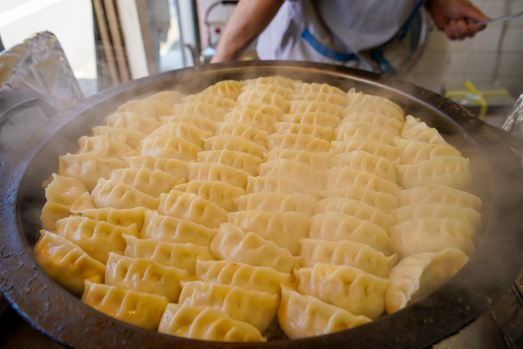 蒸し焼きしている最中の餃子は圧巻!見ているだけでお腹がすいてきますね・・・!ひとつの窯に約60個の餃子を敷き詰めて焼いているそうです。