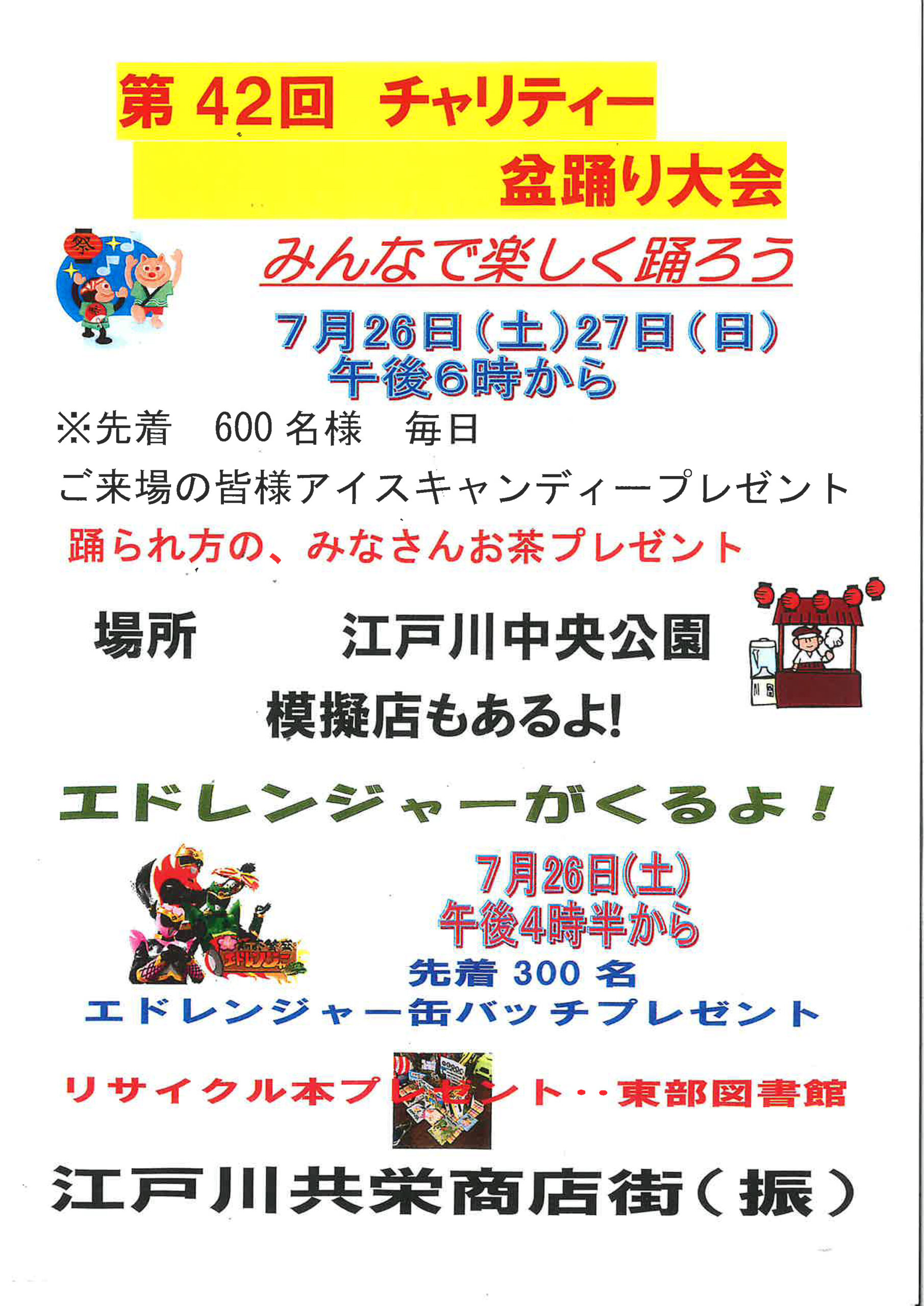 7月26日(土)27日(日)第42回チャリティー盆踊り大会 26日午後4時半からエドレンジャー登場!