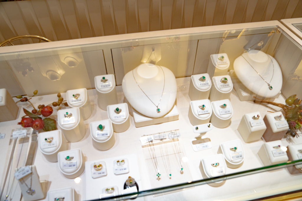 社長:オリジナルブランドの「加代子ジュエリー」も大変人気です。こちらも同じくレアストーンだったり、少々変わった宝石を使っているんですけれども、このキラキラと輝く宝石をどうしたら一番綺麗に、魅力的にジュエリーとしてセッティングできるか、表現できるかというのを考えて、手触りや付け心地にこだわって 一点ずつ作っているシリーズです。