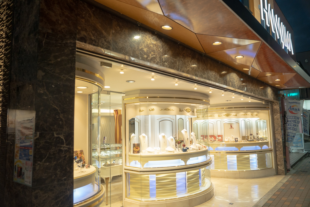 煌びやかな店構えが際立ちます。お客様が絶えずご来店され、商品をじっくりご覧になったり、ご相談されているお客様もいらっしゃいました。