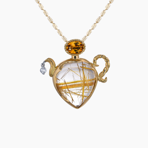 もう一つはティーポットのペンダントです。こちらはルチルクォーツという、中に金繊維が内包されている宝石ですが、この繊維を茶葉に見立てて、茶壺の中で茶葉が舞っているような様子を表現しています。