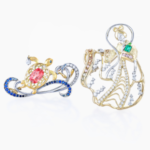 K18/PTエメラルドの玉手箱を持つ乙姫様とロードクロサイトの甲羅を持つ亀のペンダントブローチ(左)、PT/K18ルチルクォーツのティーポットペンダント(右)。