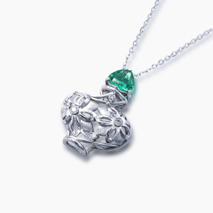香水瓶モチーフのPTエメラルドペンダントネックレス(左)、花束モチーフのPTサファイアペンダント(右)。カラーストーンが目を引きます。