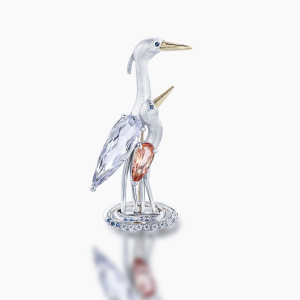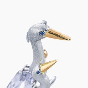 K18/PTアオサギペンダントブローチ。宝石の美しさはもちろん、金属部分の艶のあり・なしによって立体感が見事に表現されています。