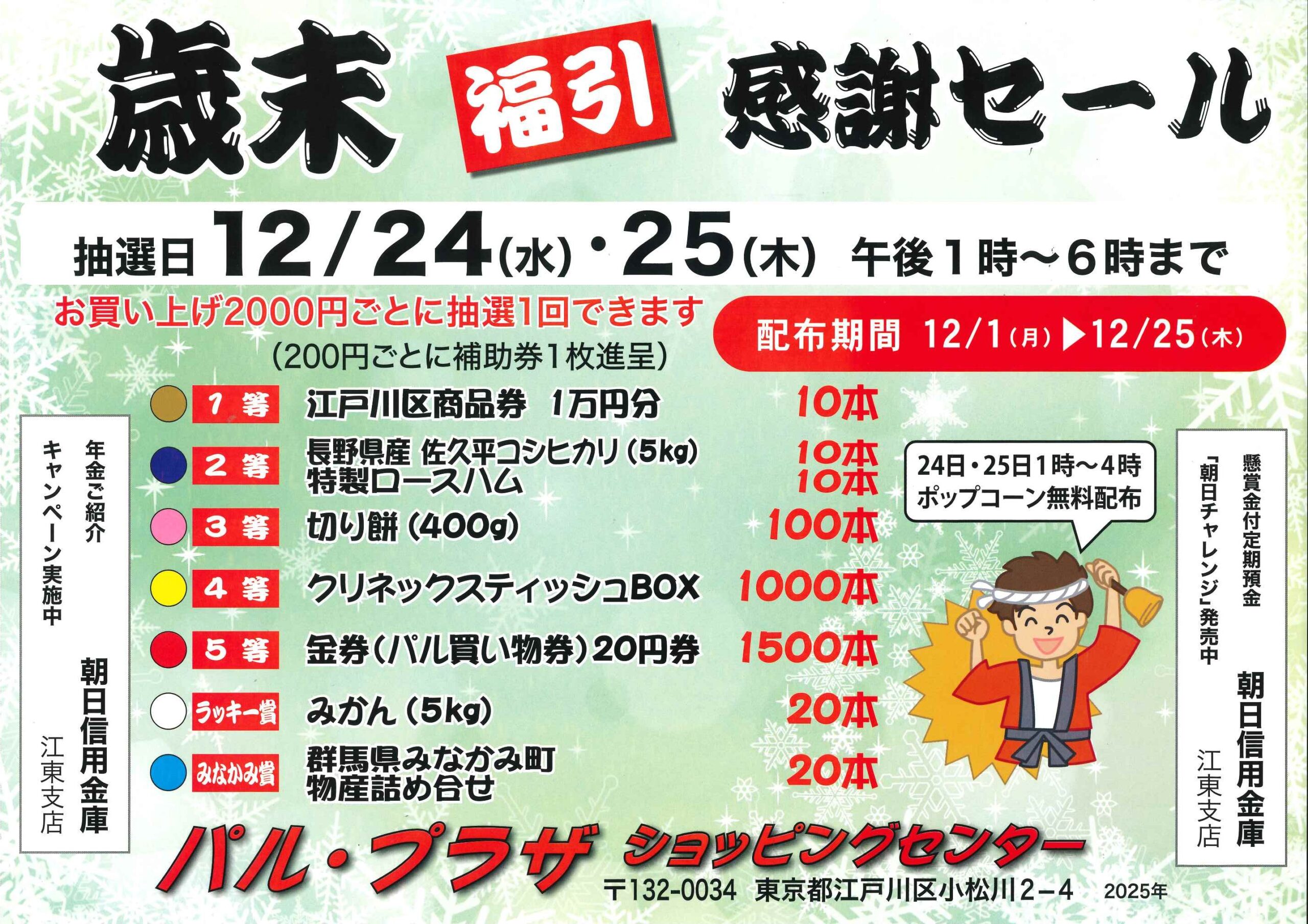 12月242025 ■抽選日:令和7年12月24日(水)12月25日(木) 午後1時~6時まで ●配布期間:12月01日(月)~12月25日(木) ※詳細はポスターをご参照ください。 カテゴリー: イベント, お知らせ, パルプラザショッピングセンター商店会2025.12.24投稿ナビゲーション前へ前の投稿:2025歳末福引大売出し 【さくら通り春日町商店会】関連記事2025歳末福引大売出し 【さくら通り春日町商店会】2025.12.16商品券のご利用は12月31日まで!年末のお買い物にぜひ♪2025.12.1512/14(日)歳末ビッグシェアセール商店会・合同歳末大売出し【江戸川共栄商店街(振)・南篠崎商店会】2025.11.2712月14日(日)2025元気出せ花街道歳末大抽選会 エドレンジャーショー【篠崎中央商店街振興組合】2025.11.20mIzuillumi【瑞江駅前商店会】2025.11.202025ウィンターセール【京成小岩商栄会】2025.11.20