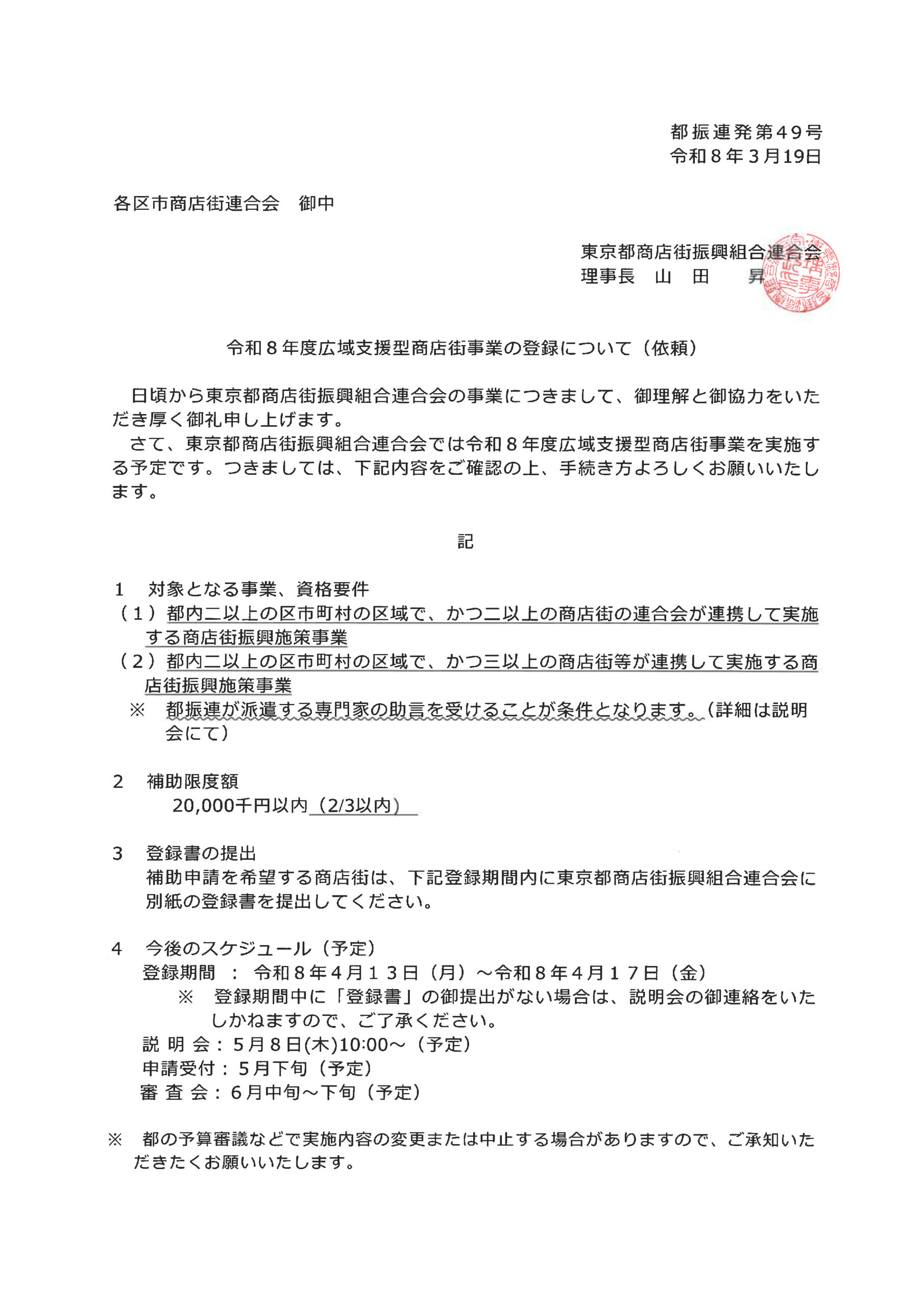 3月232026 令和8年度広域支援型商店街事業を実施する予定です。 内容をご確認の上、手続きの方よろしくお願いいたします。 <登録書はこちらからダウンロードしてください。> カテゴリー: 会員の皆様へ2026.03.23投稿ナビゲーション前へ前の投稿:高い技術と豊富な品揃えで選ばれ続ける剣道具専門店 「江戸川防具」関連記事【令和7年度DX応援隊 事例報告会のお知らせ】2026.03.13有効期限を迎える「ポイントカード(プレミアム)」の換金について(お願い)2026.03.11有効期限を迎える商品券について2026.03.11プレミアム商品券の換金について2026.01.09【江戸川区食品ロス削減推進表彰に係る推薦について】2026.01.06【年末・年始の休日のお知らせ】2025.12.16